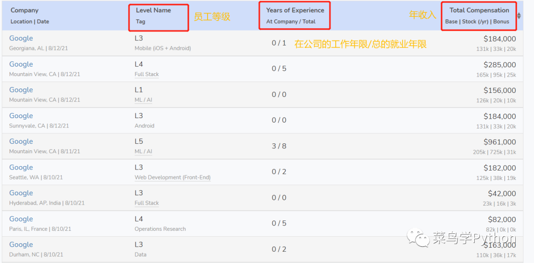 谷歌作为全球顶尖的互联网公司,其员工待遇自然是非常具有竞争力。根据Levels.fyi统计的全球程序员收入,我们可以看到谷歌员工在不同等级以及工作经验下的收入情况。