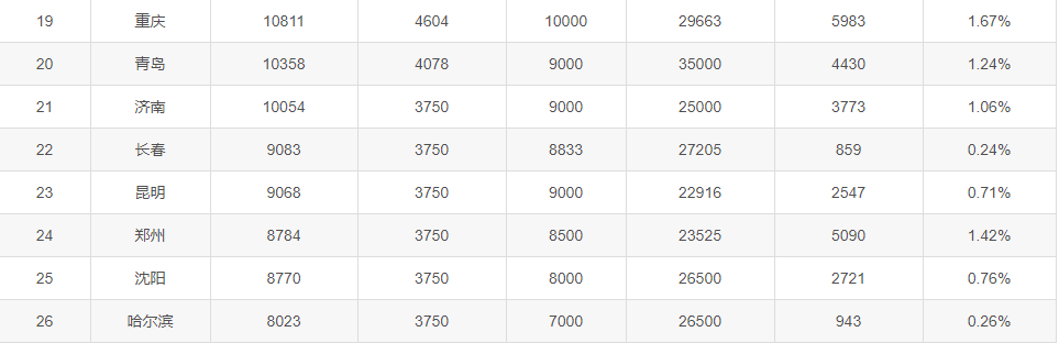 北京依然第一,中位数达到1.7W+,前三北上深无较大差异。