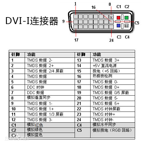 DVI-I接口是兼容数字和模拟接口的,为了兼容VGA模拟信号,就比DVI-D多了4个信号引脚,用来传输模拟信号。