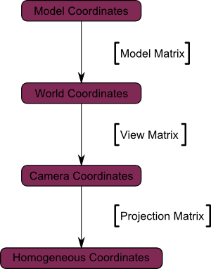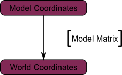 从模型空间(Model Space)(顶点都相对于模型的中心定义)变换到世界空间(顶点都相对于世界空间中心定义)。