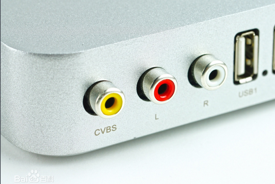 复合视频信号(CVBS)接口,也就是通常所称的RCA接口。RCA 是Radio Corporation of American的缩写词,因为RCA接头由这家公司发明的。RCA俗称莲花插座、梅花头、,又叫AV端子,也称AV 接口,通常都是成对的白色的音频接口和黄色的视频接口,它通常采用RCA(俗称莲花头)进行连接,使用时只需要将带莲花头的标准AV 线缆与相应接口连接起来即可。RCA接头是目前为止最为常见的一种音/视频接线端子。RCA音频端子一般成对地用不同颜色标注:右声道用红色,左声道用黑色或白色。一般来讲,RCA立体声音频线都是左右声道为一组,每声道外观上是一根线。通常都是成对的音频接口右声道(红色)左声道(白色)和视频接口(黄色)