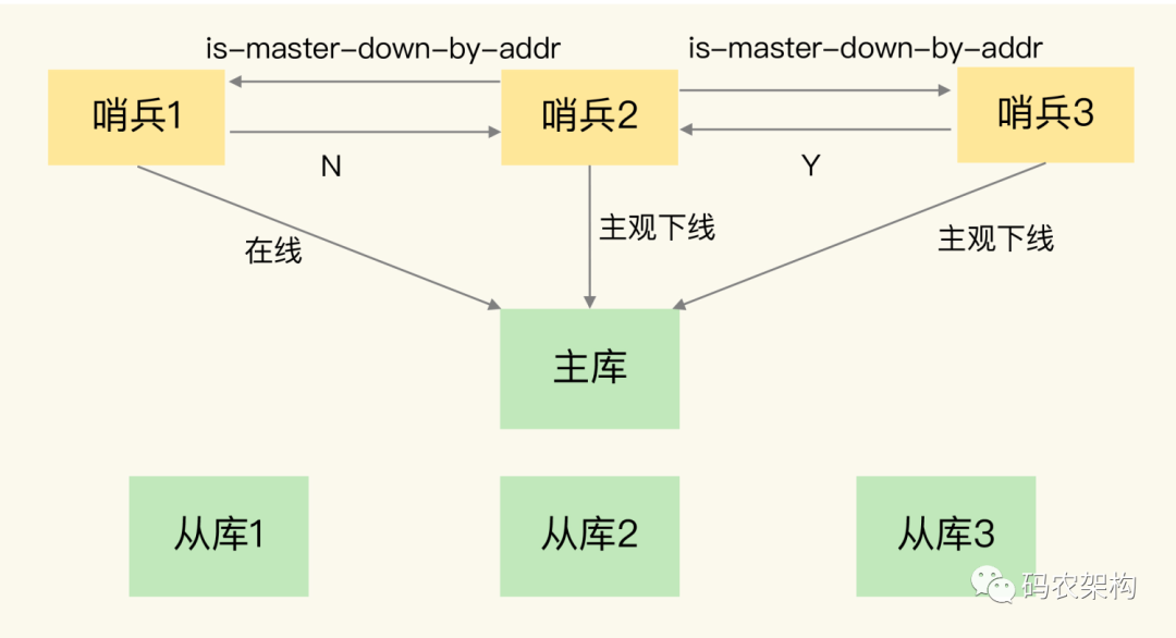 任何一个实例只要自身判断主库“主观下线”后,就会给其他实例发送 is-master-down-by-addr 命令。接着,其他实例会根据自己和主库的连接情况,做出 Y 或 N 的响应,Y 相当于赞成票,N 相当于反对票。