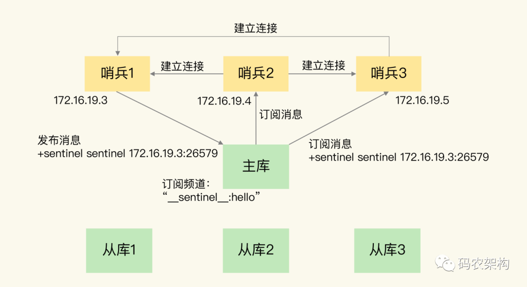 哨兵将自己的连接信息 (ip, port) 发布到主库上, 其它哨兵订阅