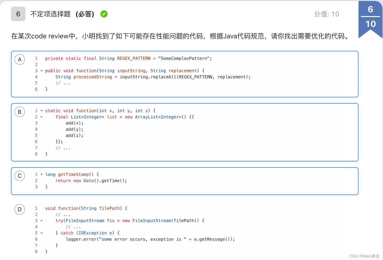 A选项中的REGEX_PATTERN应当预处理为Pattern类,避免每次调用都要构建匹配树;B选项在方法中使用了双大括号初始化创建了额外的临时类,导致性能损失;C选项构建了一个Date类实例来获取时间戳,造成无谓的性能损失,应当直接使用System.currentTimeMillis()方法获取;D选项使用try-with-resource语法,不存在性能问题。