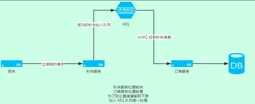 - 通过消息队列存储成功的秒杀信息,下游订单系统处理