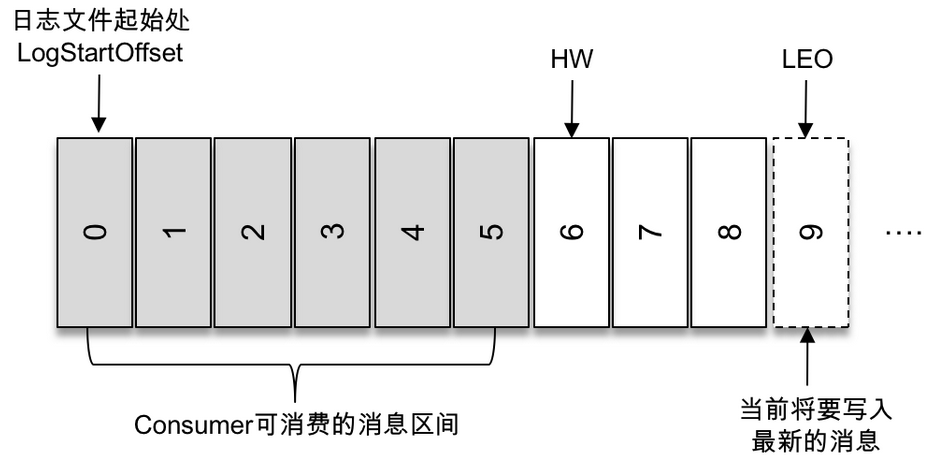 LEO(Log End Offset):标识当前日志文件中下一条待写入消息的 offset,上图中 offset 为9的位置即为当前日志文件的 LEO,LEO 的大小相当于当前日志分区中最后一条消息的 offset 值加1。分区 ISR 集合中的每个副本都会维护自身的 LEO,而 ISR 集合中最小的 LEO 即为分区的 HW,对消费者而言只能消费 HW 之前的消息。