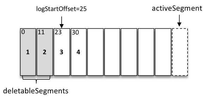 从头开始遍历每个日志分段,日志分段1的下一个日志分段的起始偏移量为11,小于 logStartOffset 的大小,将日志分段1加入 deletableSegments。日志分段2的下一个日志偏移量的起始偏移量为23,也小于 logStartOffset 的大小,将日志分段2加入 deletableSegments。日志分段3的下一个日志偏移量在 logStartOffset 的右侧,故从日志分段3开始的所有日志分段都不会加入 deletableSegments。收集完可删除的日志分段的文件集合之后的删除操作同基于日志大小的保留策略和基于时间的保留策略相同