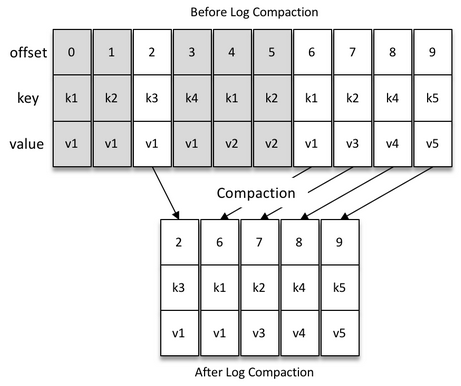 日志压缩(Log Compaction):针对每个消息的 key 进行整合,对于有相同 key 的不同 value 值,只保留最后一个版本。