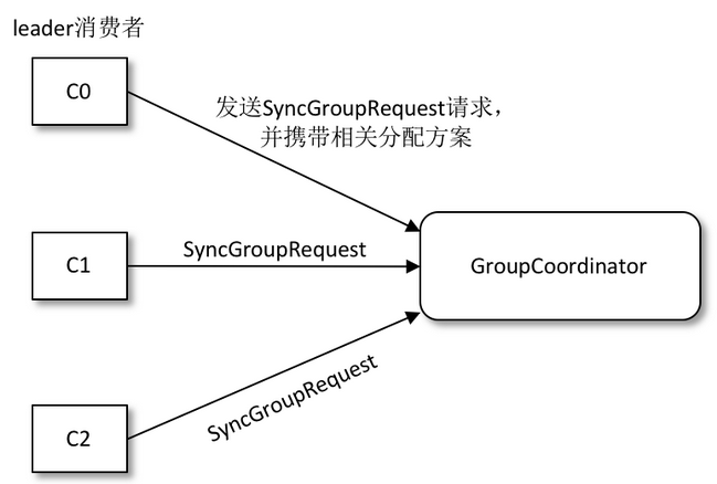 第三阶段(SYNC_GROUP):Leader 消费者根据在第二阶段中选举出来的分区分配策略来实施具体的分区分配,在此之后需要将分配的方案同步给各个消费者,通过 GroupCoordinator 这个“中间人”来负责转发同步分配方案的。