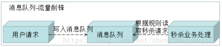【3】流量削锋:场景说明:秒杀或团抢活动中使用广泛。秒杀活动,一般会因为流量过大,导致流量暴增,应用挂掉。一般需要在应用前端加入消息队列。