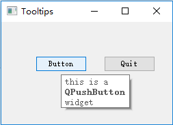 import sys from PyQt4 import QtGui,QtCore class winForm(QtGui.QWidget): def __init__(self): super(winForm,self).__init__() self.initUI() def initUI(self): QtGui.QToolTip.setFont(QtGui.QFont('SansSerif',10)) self.setToolTip('this is a <b>QWidget</b> widget') btn=QtGui.QPushButton('Button',self) btn.setToolTip('this is a <b>QPushButton</b> widget') btn.resize(btn.sizeHint()) btn.move(50,50) btn1=QtGui.QPushButton('Quit',self) btn1.clicked.connect(QtCore.QCoreApplication.instance().quit) btn1.resize(btn1.sizeHint()) btn1.move(150,50) self.setGeometry(300,300,250,150) self.setWindowTitle('Tooltips')