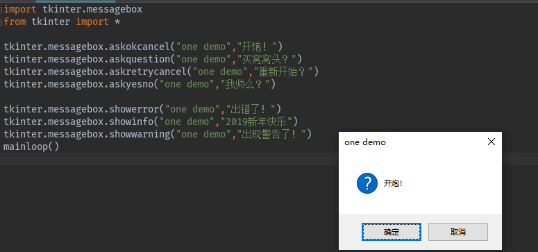tkinter.messagebox.askokcancel("one demo","开炮!")