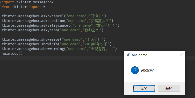 tkinter.messagebox.askquestion("one demo","买窝窝头?")