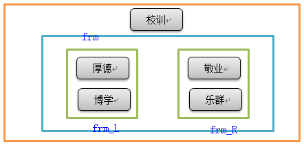 1 from tkinter import * 2 root = Tk() 3 root.title("hello world") 4 root.geometry('300x200') 5 6 Label(root, text='校训', font=('Arial', 20)).pack() 7 8 frm = Frame(root) 9 frm_L = Frame(frm) # left 10 Label(frm_L, text='厚德', font=('Arial', 15)).pack(side=TOP) 11 Label(frm_L, text='博学', font=('Arial', 15)).pack(side=TOP) 12 frm_L.pack(side=LEFT) 13 14 frm_R = Frame(frm) # right 15 Label(frm_R, text='敬业', font=('Arial', 15)).pack(side=TOP) 16 Label(frm_R, text='乐群', font=('Arial', 15)).pack(side=TOP) 17 frm_R.pack(side=RIGHT) 18 19 frm.pack() #显示控件 20 root.mainloop() # 进入循环,显示窗口