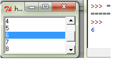 1 from Tkinter import * 2 root = Tk() 3 root.title("hello world") 4 root.geometry() 5 6 def print_item(event): 7 print lb.get(lb.curselection()) 8 9 var = StringVar() 10 lb = Listbox(root, height=5, selectmode=BROWSE, listvariable = var) 11 lb.bind('<ButtonRelease-1>', print_item) 12 list_item = [1, 2, 3, 4, 5, 6, 7, 8, 9, 0] 13 for item in list_item: 14 lb.insert(END, item) 15 16 scrl = Scrollbar(root) 17 scrl.pack(side=RIGHT, fill=Y) 18 lb.configure(yscrollcommand = scrl.set) 19 lb.pack(side=LEFT, fill=BOTH) 20 scrl['command'] = lb.yview 21 22 root.mainloop()