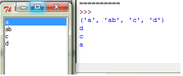 1 # selectmode可以为BROWSE MULTIPL SINGLE 2 from tkinter import * 3 4 root = Tk() 5 root.title("hello world") 6 root.geometry() 7 8 def print_item(event): 9 print(lb.get(lb.curselection())) 10 11 var = StringVar() # 绑定变量 12 lb = Listbox(root, listvariable=var) # 创建列表 13 list_item = [1, 2, 3, 4] # 控件的内容为1 2 3 4 14 for item in list_item: 15 lb.insert(END, item) # 添加 16 lb.delete(2, 4) # 删除,此时控件的内容为1 3 17 18 var.set(('a', 'ab', 'c', 'd')) # 设置列表所有值 19 print(var.get()) # 得到列表所有值 20 lb.bind('<ButtonRelease-1>', print_item) # 释放鼠标触发事件 21 lb.pack() 22 23 root.mainloop()