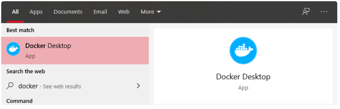 打开Windows开始菜单,然后键入“ docker”,单击名称以启动应用程序: