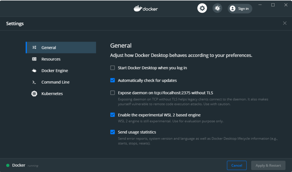 默认情况下,WSL2集成处于未启用状态,因此请单击“ Enable the experimental WSL 2 based engine ”,然后单击“ Apply & Restart ”: