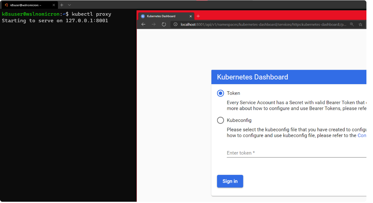 # Access the Dashboard from a browser on Windows side with the URL: localhost:<port exposed>