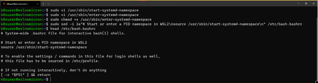 sudo sed -i 2a"# Start or enter a PID namespace in WSL2nsource /usr/sbin/start-systemd-namespacen" /etc/bash.bashrc