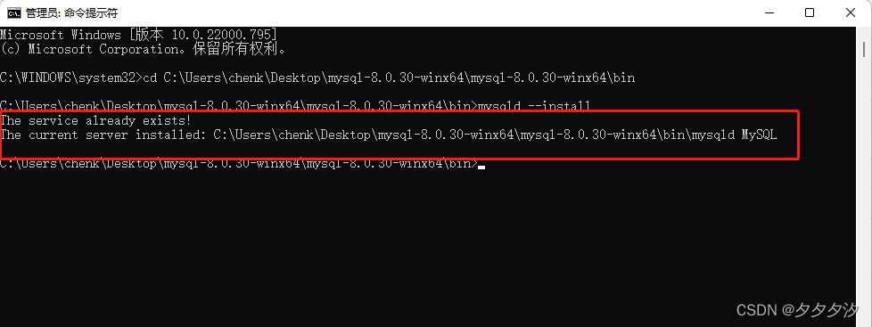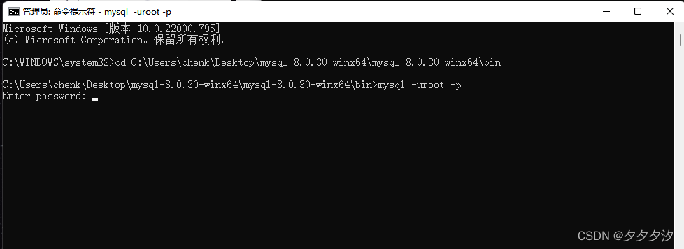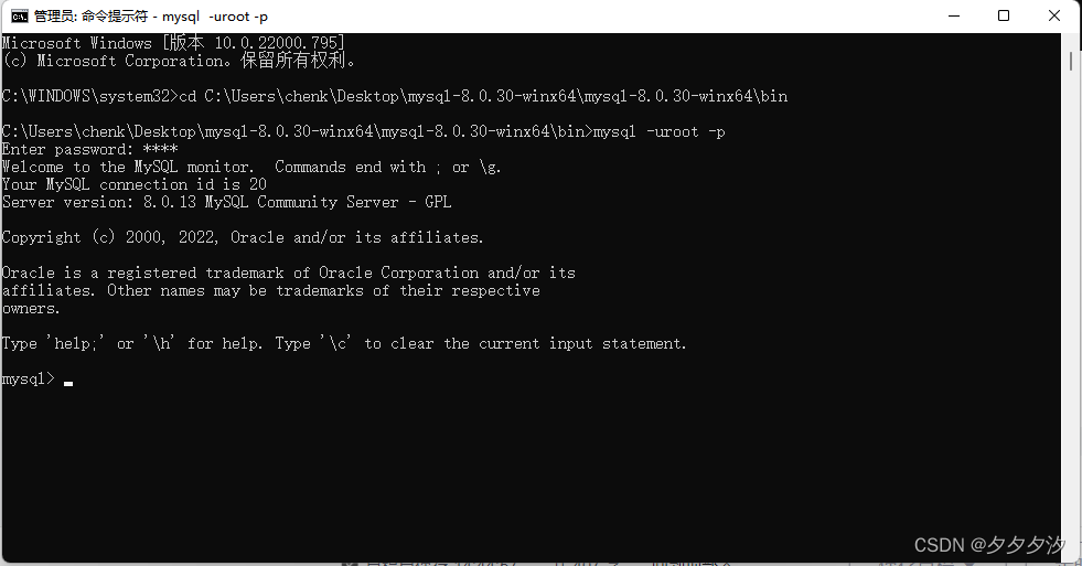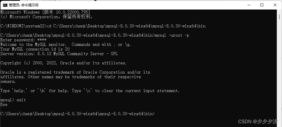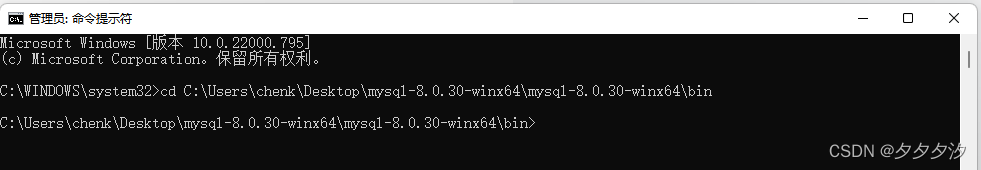 例:cd C:UserschenkDesktopmysql-8.0.30-winx64mysql-8.0.30-winx64bin