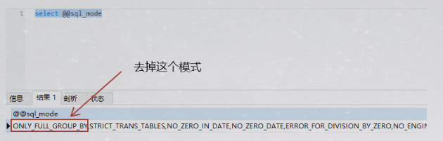 关于sql_mode,像下面这个报错,就是因为group by字段必须完全显示在查询列里,所以去掉这个模式,就不在报错了