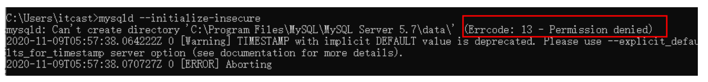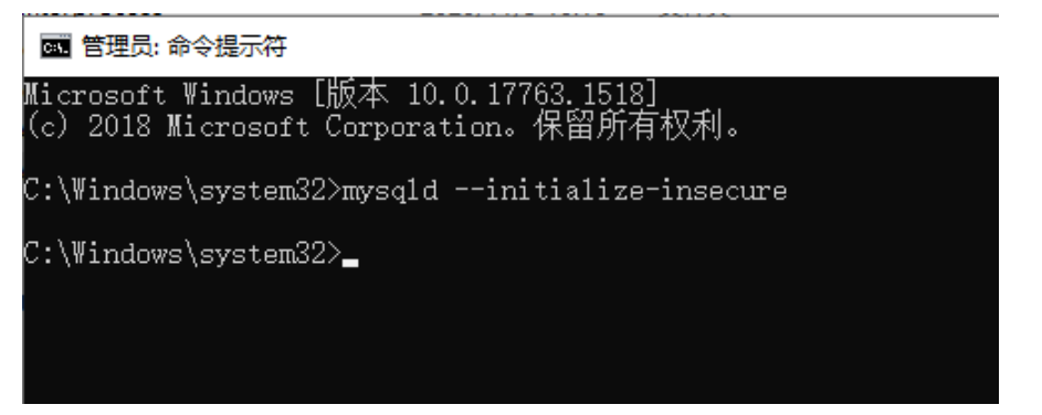 (1)在刚才的黑框中敲入mysqld --initialize-insecure,回车,稍微等待一会,如果出现没有出现报错信息(如下图)则证明data目录初始化没有问题,此时再查看MySQL目录下已经有data目录生成。