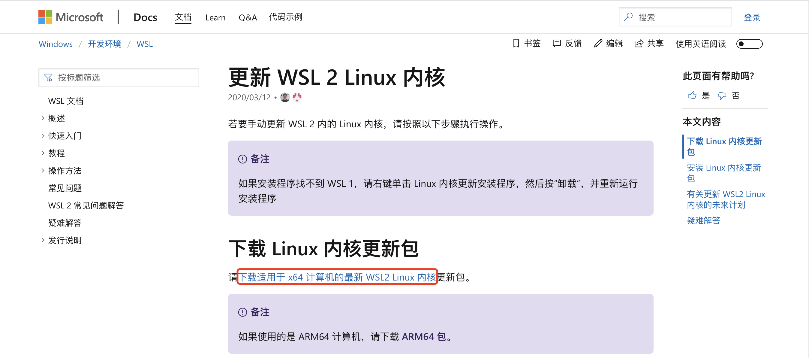 下载适用于 x64 计算机的最新 WSL2 Linux 内核进行下载。