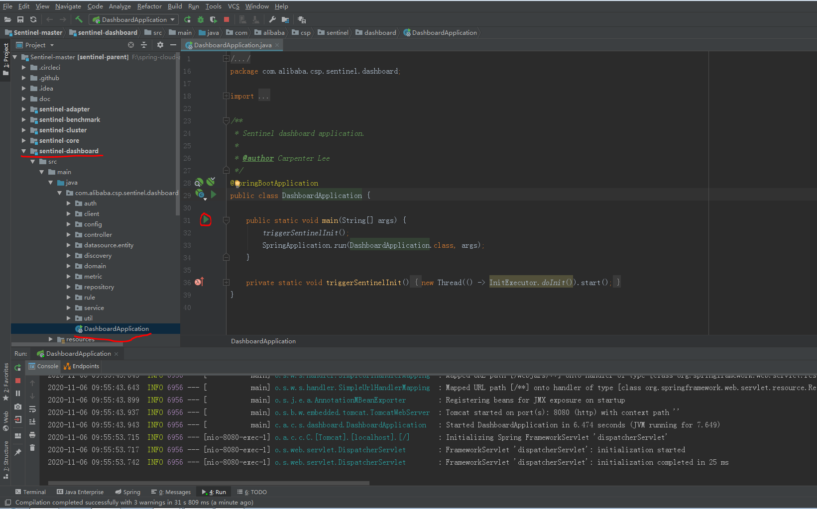 然后启动本地的sentinel-dashboard项目: