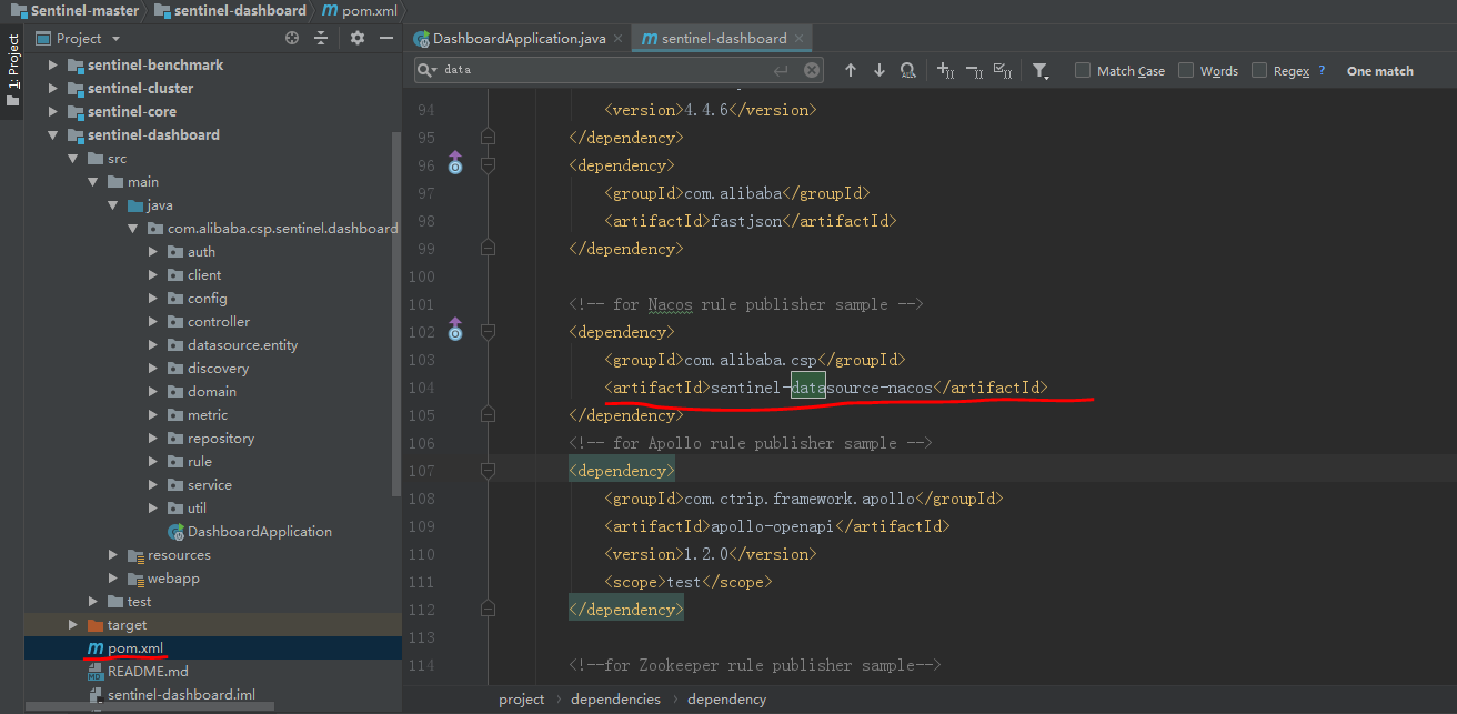 找到sentinel-dashboard的pom文件,将sentinel-datasource-nacos中的<scope>test</scope>去掉,如下图