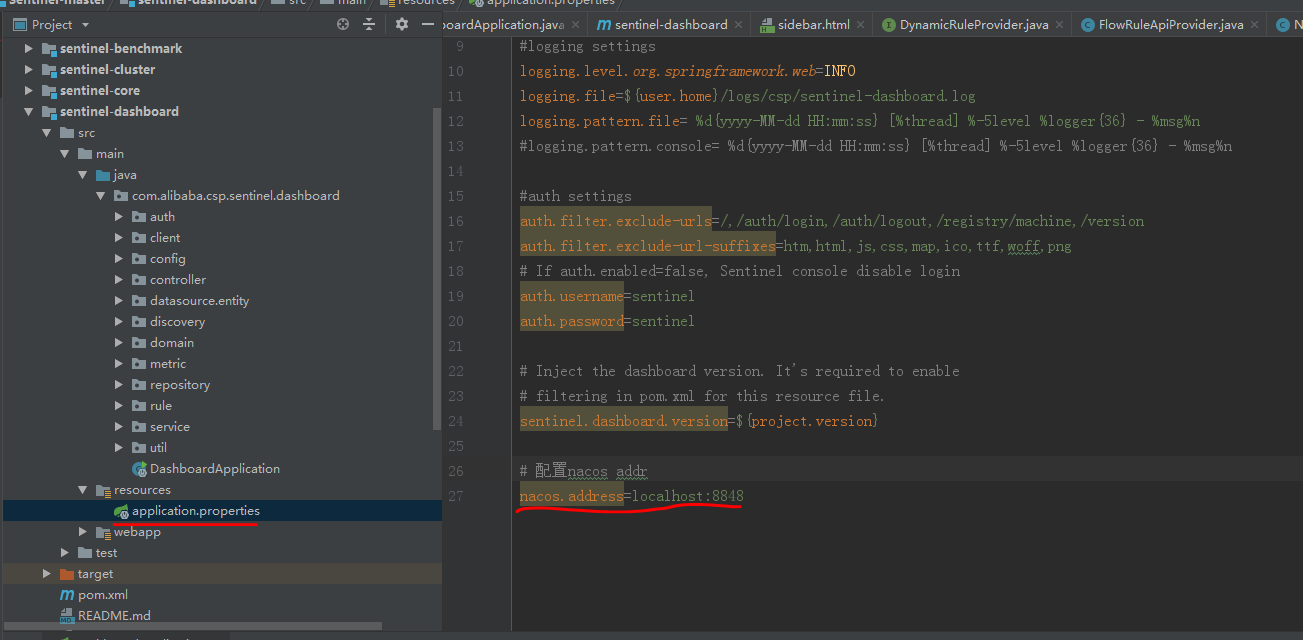 在dashboard的application.properties中增加nacos.address,如下图