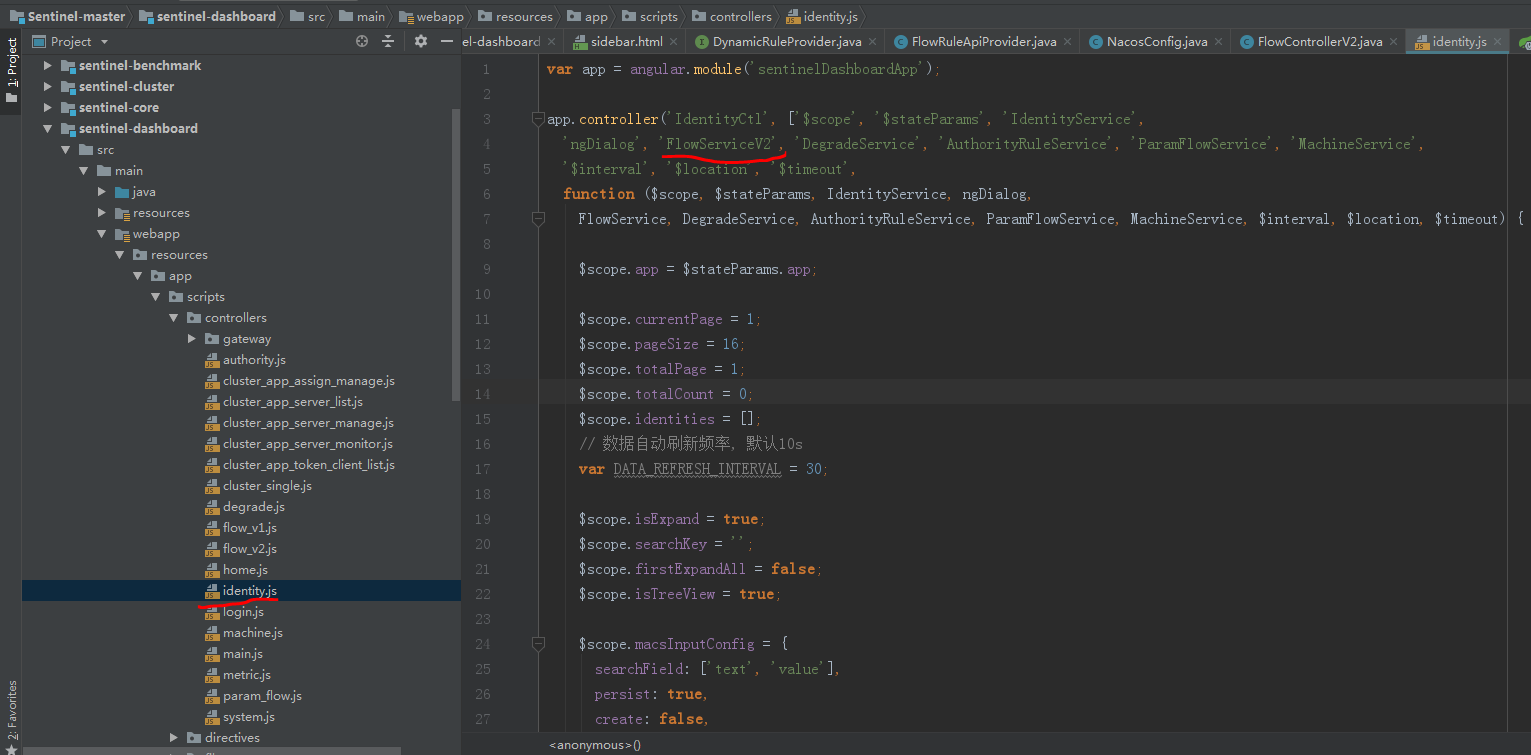 将identity.js下图中FlowServiceV1 修改为FlowServiceV2, 否则在 簇点链路 中修改流控信息会报错