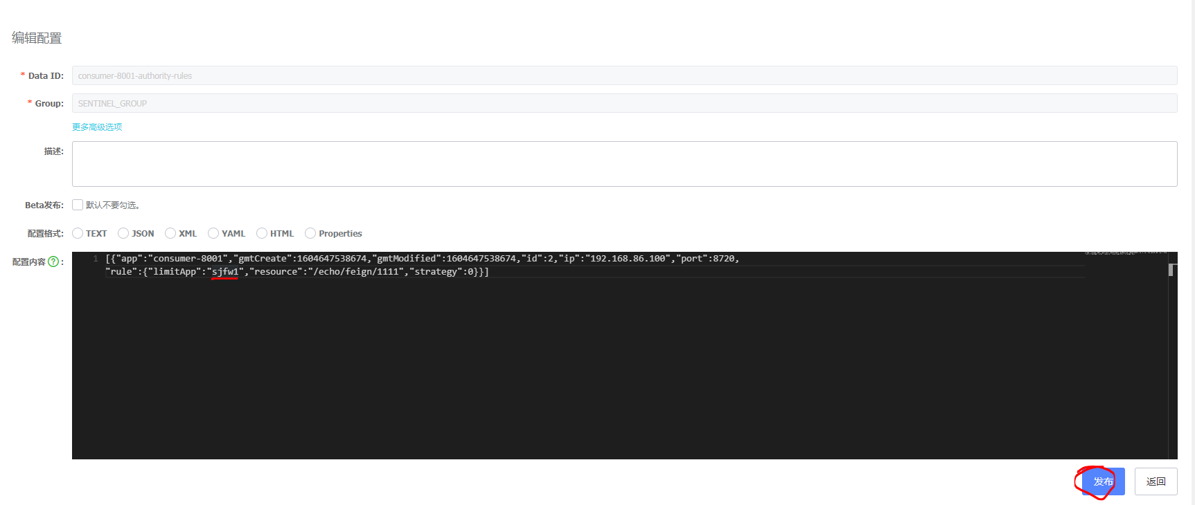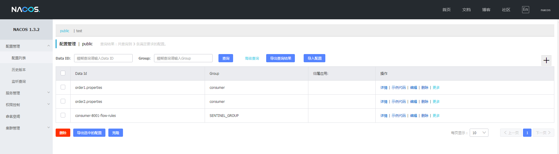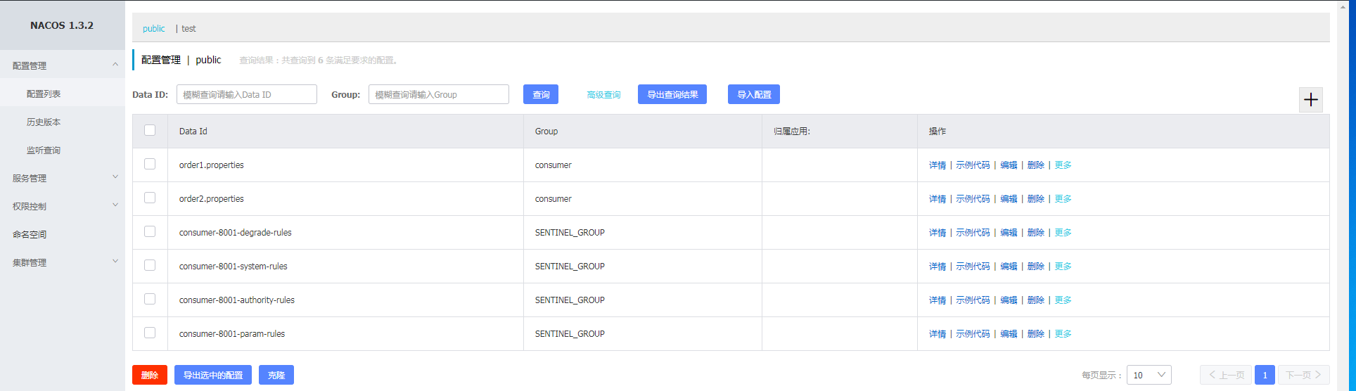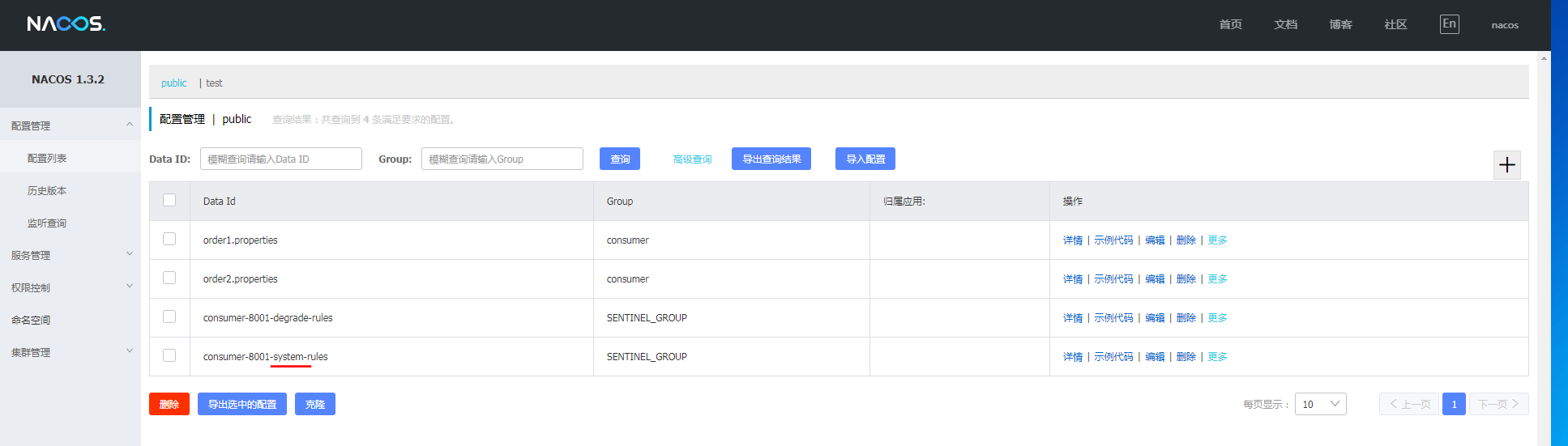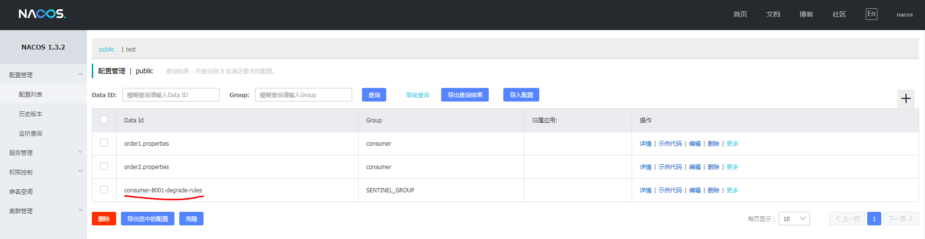 查看结果已经同步到nacos中,验证在nacos中修改此配置和删除此配置,查看是否生效,效果如图: