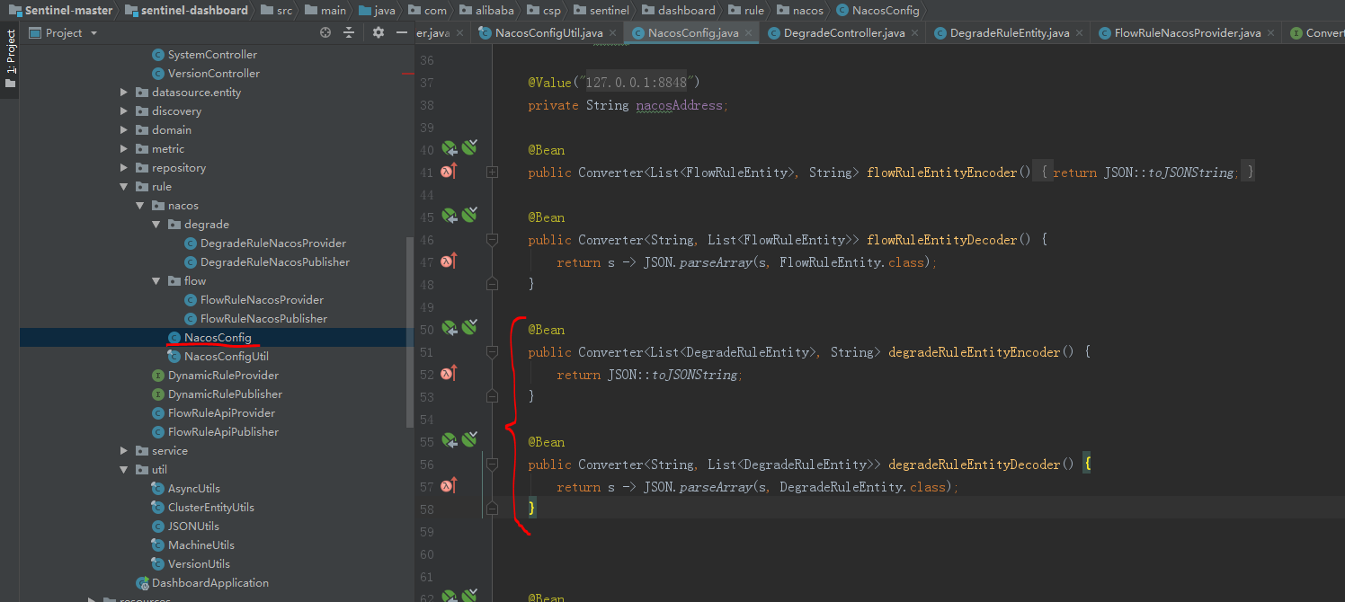 在nacos下创建flow,degrade包,拷贝flow包中的两个java文件到degrade下,并且修改类名Flow为Degrade