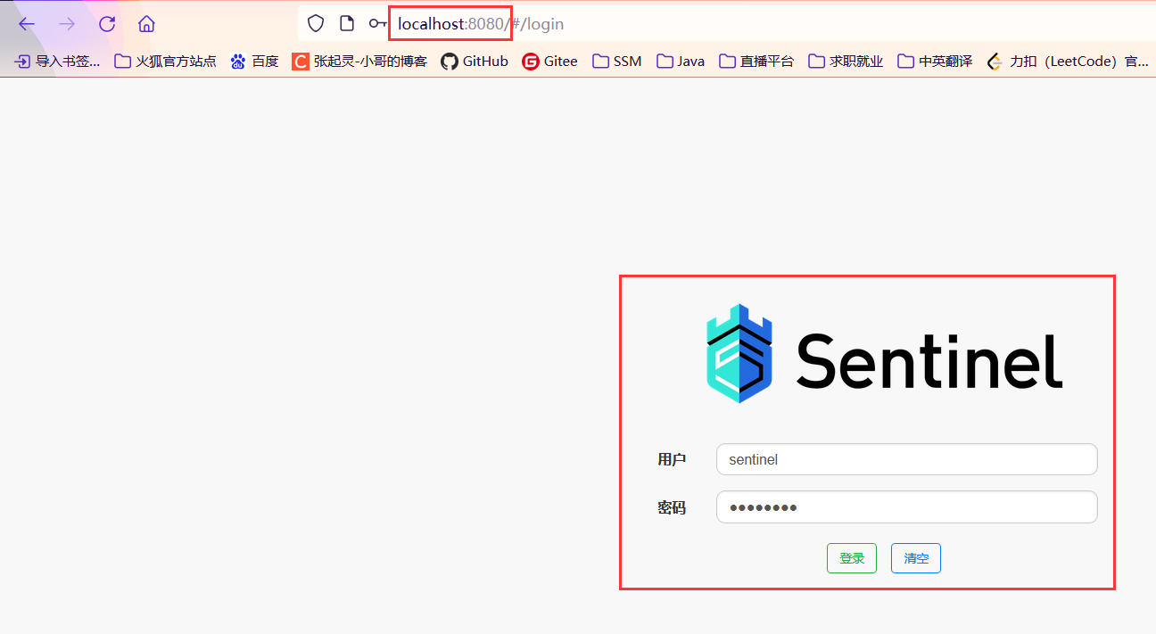 下载完Sentinel的jar包之后,直接java -jar运行即可。之后在浏览器中输入localhost:8080即可访问,账号密码都是 sentinel。在访问之前一定确保8080端口没有被占用(tomcat)。
