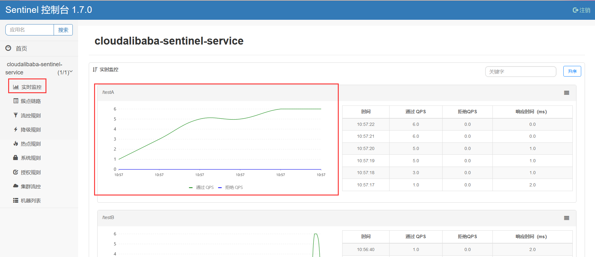 当在浏览器中多次访问testA或者testB的时候,可以在sentinel的实时监控中看到请求的曲线图变化情况。