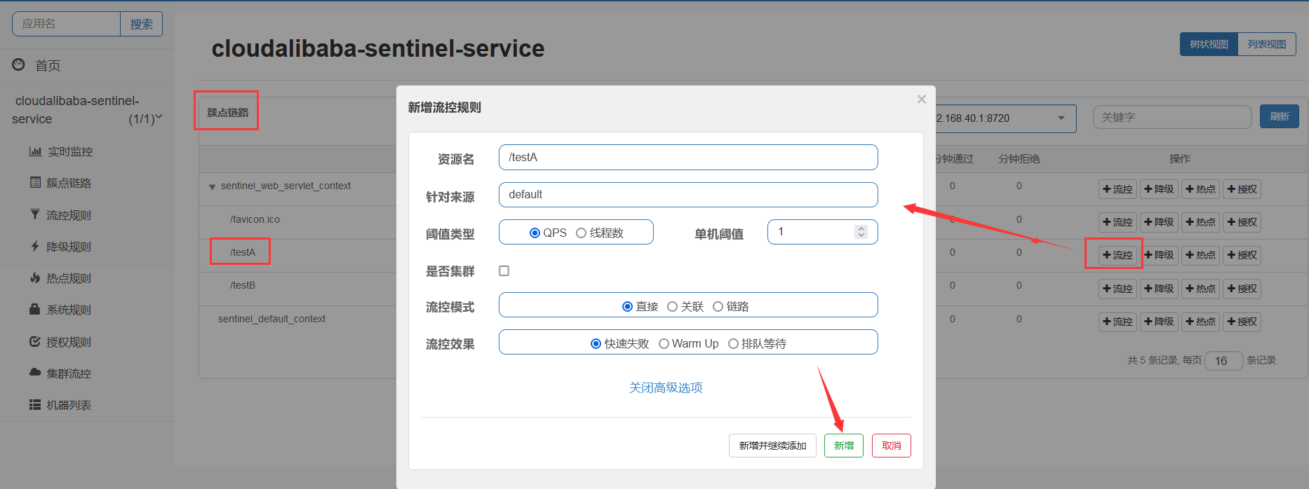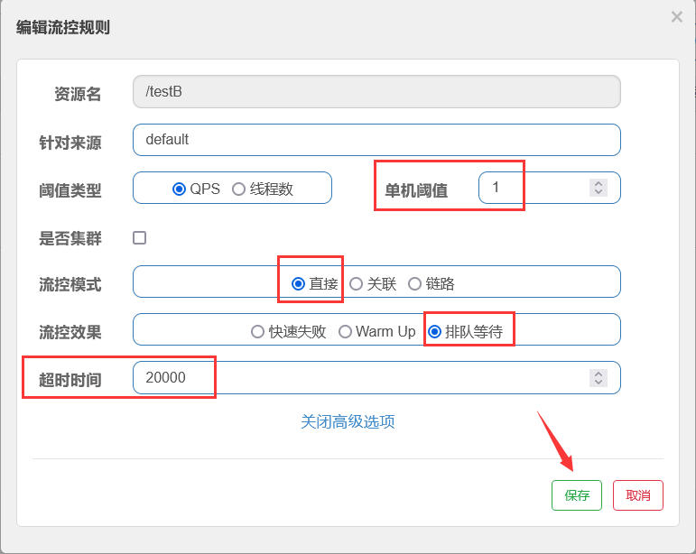 排队等待设置含义:/testA每秒1次请求,超过的话就排队等待,等待的超时时间为20000毫秒。