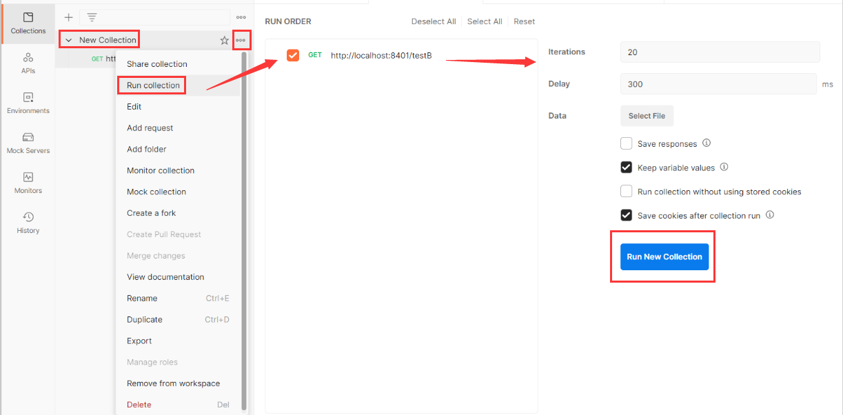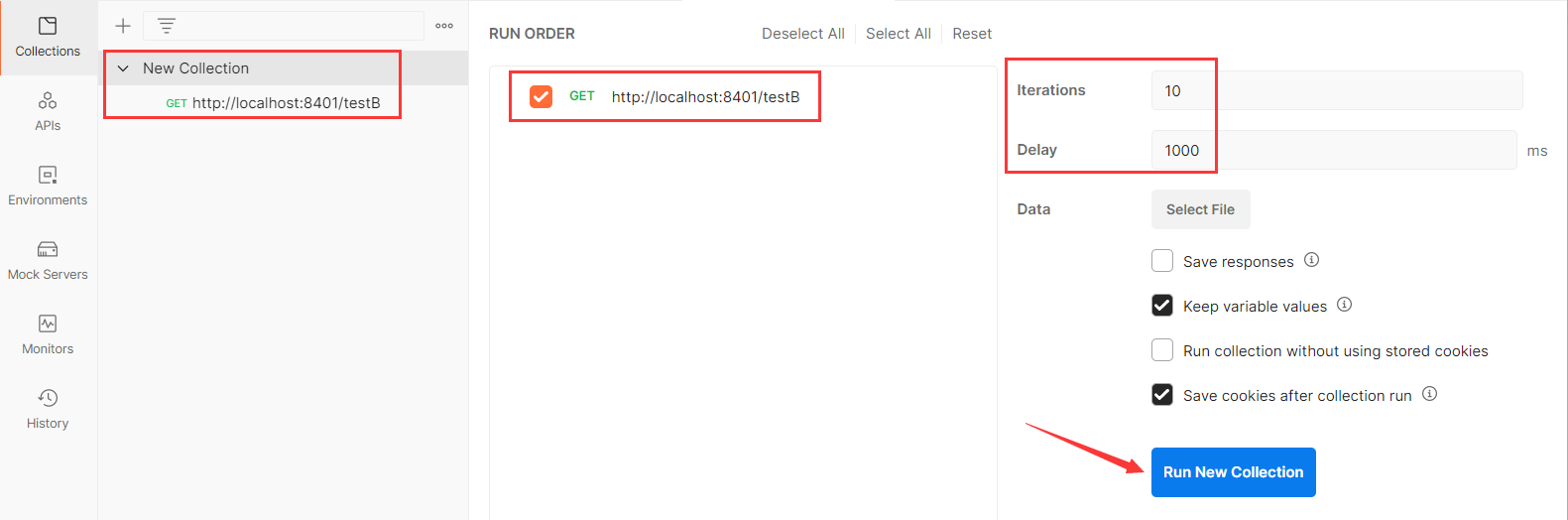 这里使用Postman来模拟并发密集访问 testB,添加一个集合,在其中设置关于 testB 请求的并发访问信息:20个线程每间隔0.3秒访问一次。