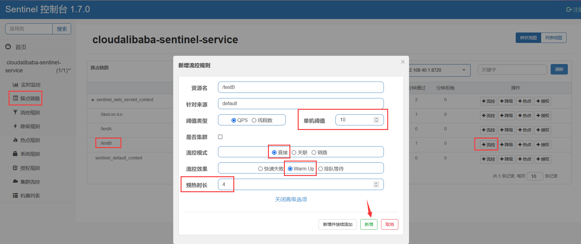 测试结果这里截图不便,情况就是:刚开始我们快速多次的访问 localhost:8041/testB,一秒钟之内超过10/3=3次,那么此时直接出现sentinel的默认出错页面信息。当慢慢的预热了4秒之后,此时阈值达到了10,我们再像之前那样快速多次的访问testB,页面就恢复正常了。
