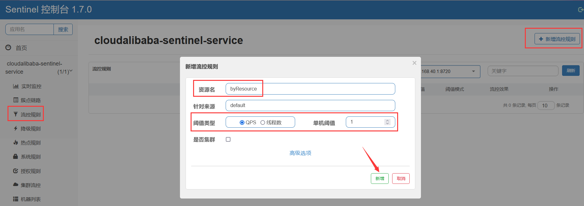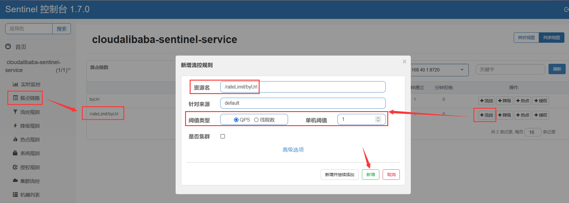 在簇点链路这里可以看到有两个,如果说是按资源名称限流,就选第一个byUrl;如果是按URL地址限流,就选第二个。