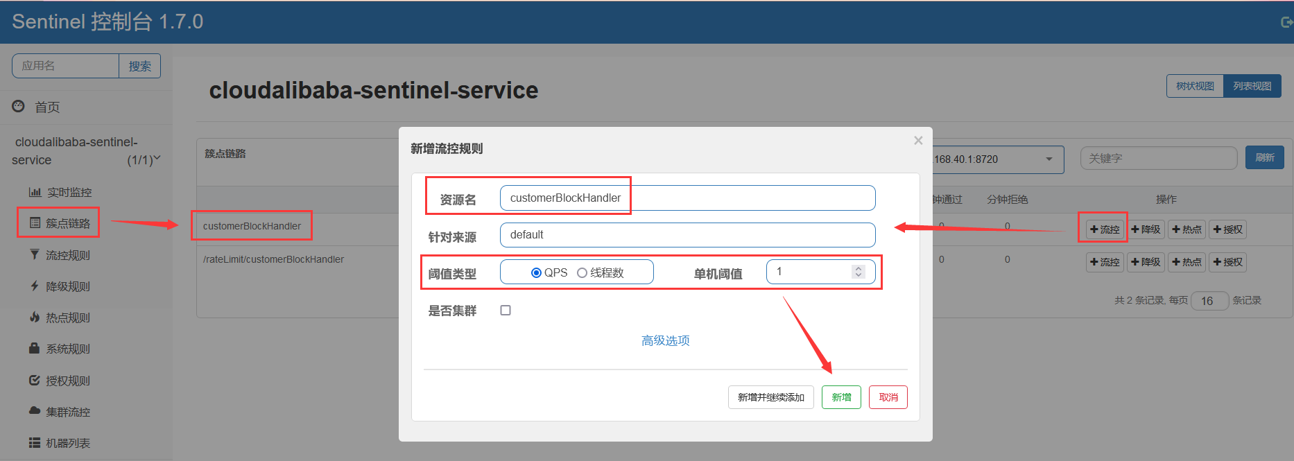 开启8401之后,先进行一次 /rateLimit/customerBlockHandler 请求的访问,然后到sentinel中设置它的限流逻辑信息,只要QPS > 1,则触发我们自定义的限流方法。在@SentinelResource注解中就对应着 blockHandlerClass、blockHandler 这两个属性,哪个类中的哪个方法是我们定义的全局限流方法。
