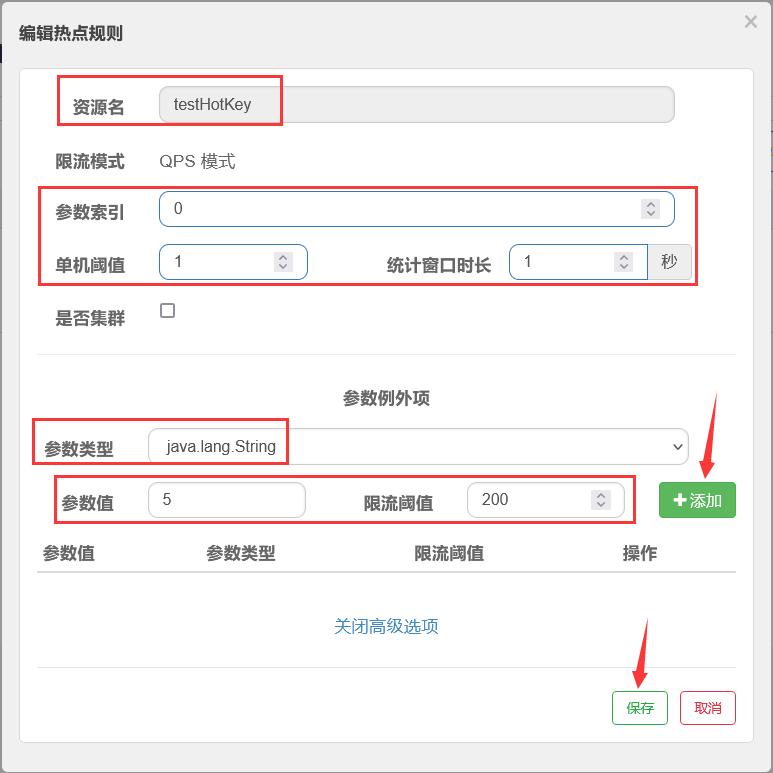 单机阀值以及统计窗口时长表示在此窗口时间超过阀值就限流。上面的抓图就是第一个参数有值的话,1秒的QPS为1,超过就限流,限流后调用deal_testHotKey降级方法。