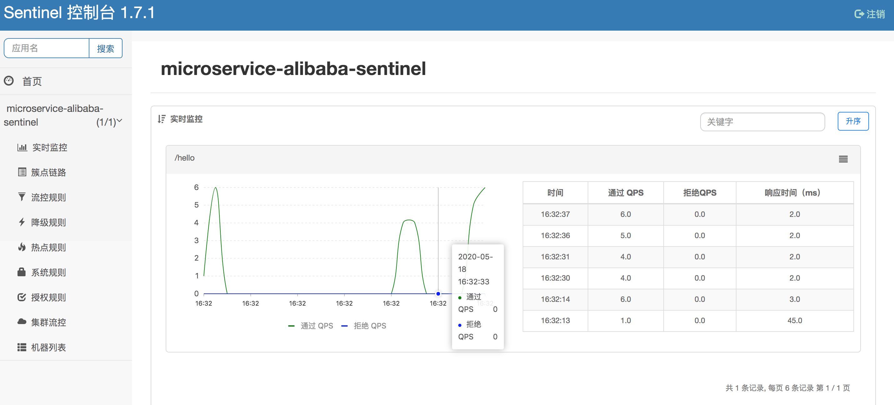 Sentinel控制台,可以看到下图,实时监控接口访问数据: