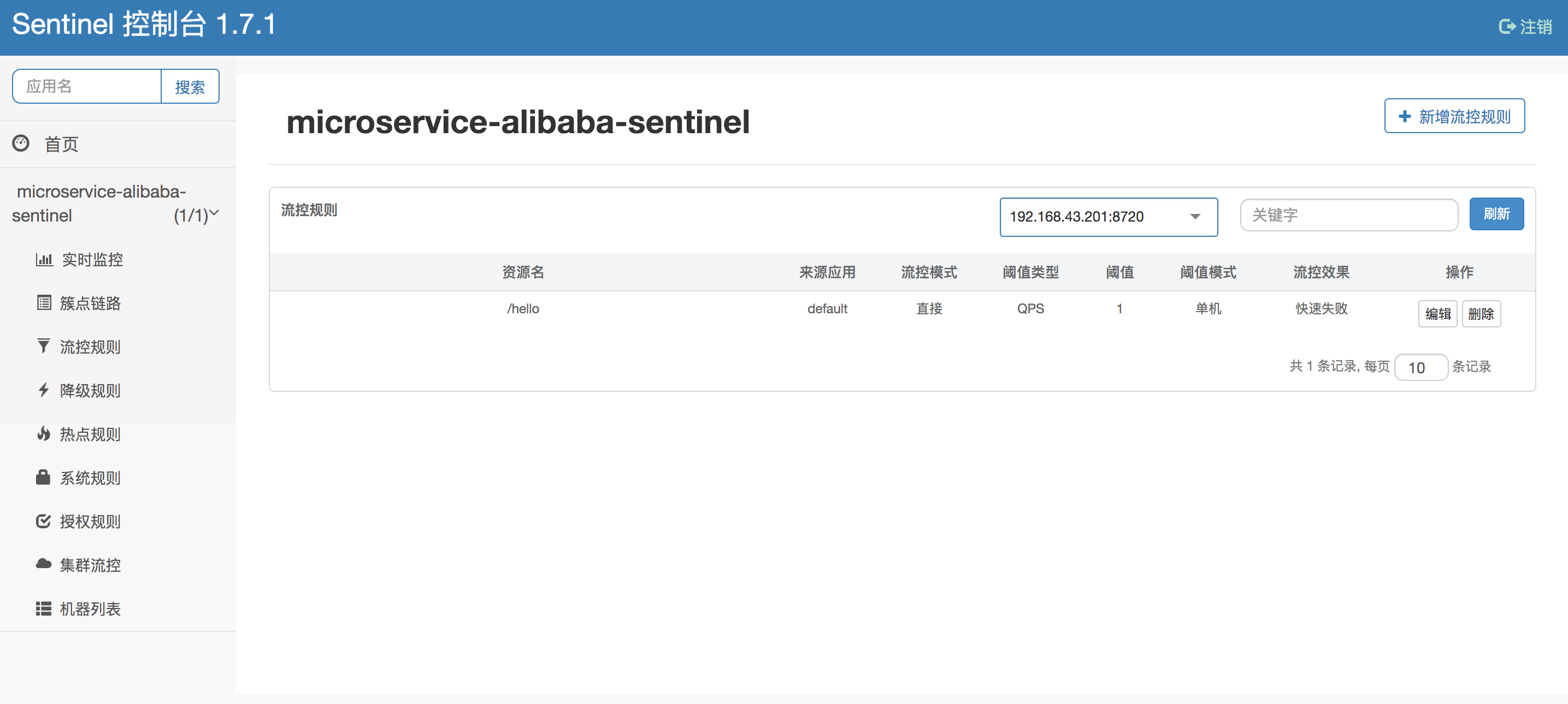 案例:新增接口流控规则,基于QPS,限定只允许每次一个请求通过