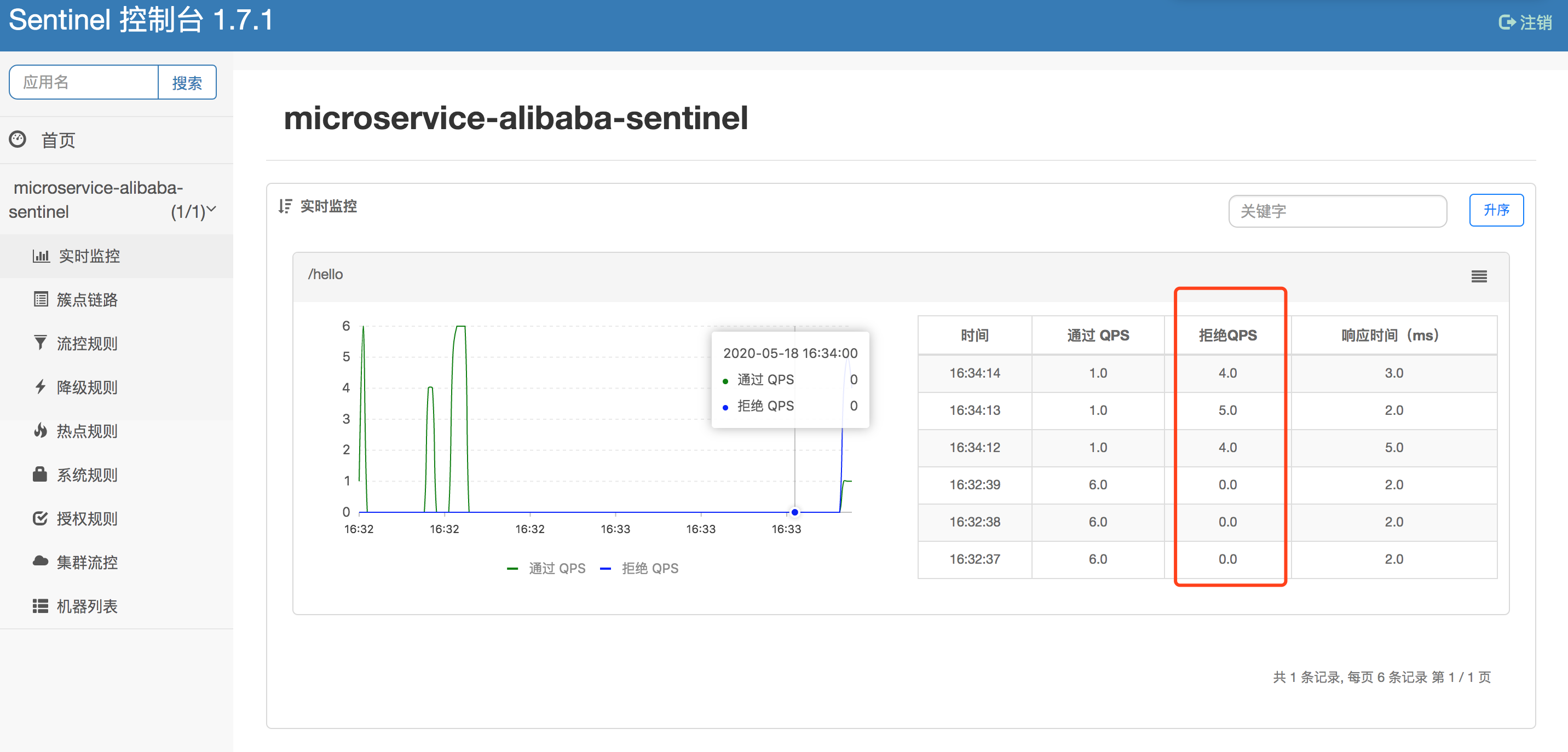表示流控规则生效了。在监控控制台上,可以看到“拒绝QPS”的值,而每次通过的QPS只有一个
