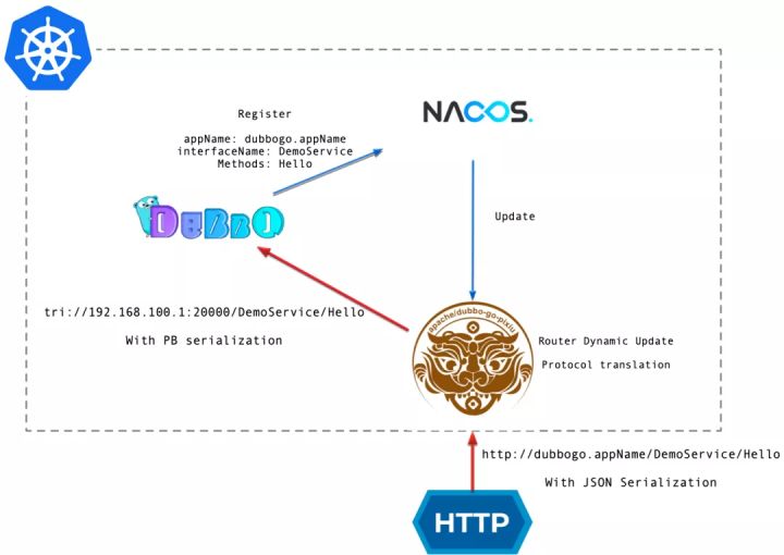 Dubbo-go-pixiu 网关支持调用 GO/Java 的 Dubbo 集群。在 Dubbo-go 3.0 的场景下,我们可以通过 Pixiu 网关,在集群外以 HTTP 协议请求 pixiu 网关,在网关层进行协议转换,进一步调用集群内的Dubbo-go 服务。
