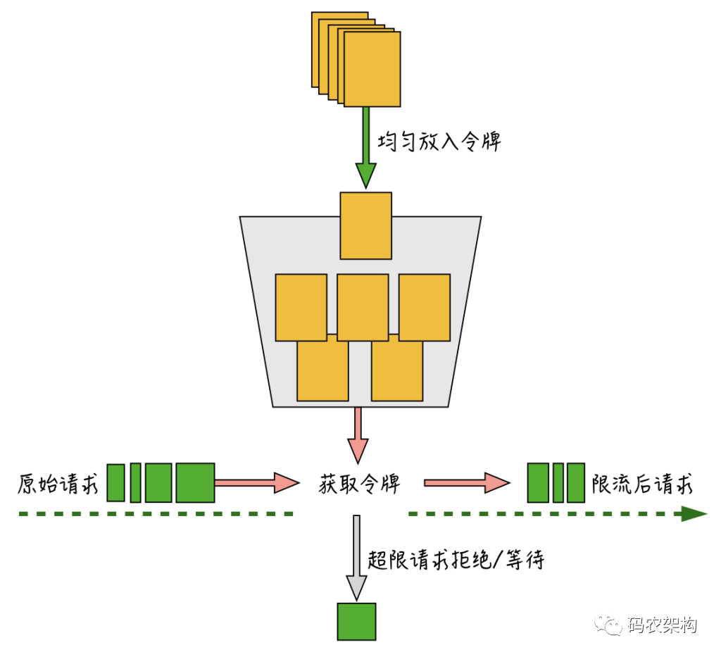 算法按一定速度均匀往桶里放入令牌,原始请求进入后,根据请求量从令牌桶里取出需要的令牌数,如果令牌数不够,会直接抛弃掉超限的请求或者进行等待,能成功获取到令牌的请求才会进入到后端服务器。