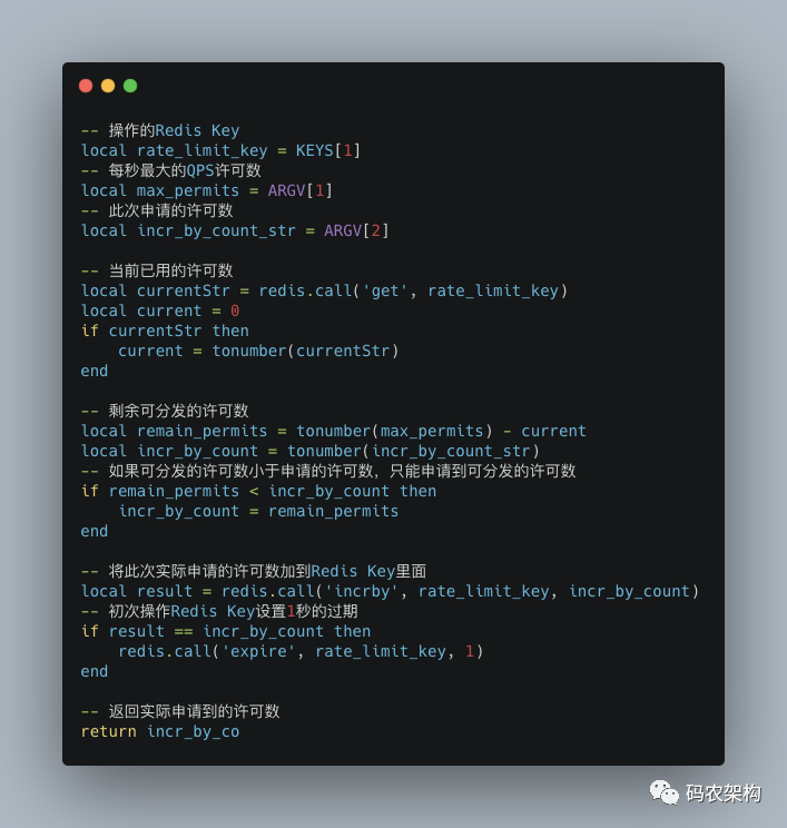 业界比较通用的全局流控方案,一般是通过中央式的资源(如:Redis、Nginx)配合脚本来实现全局的计数器,或者实现更为复杂的漏桶算法和令牌桶算法,比如可以通过 Redis 的 INCR 命令配合 Lua 实现一个限制 QPS(每秒查询量)的流控组件。