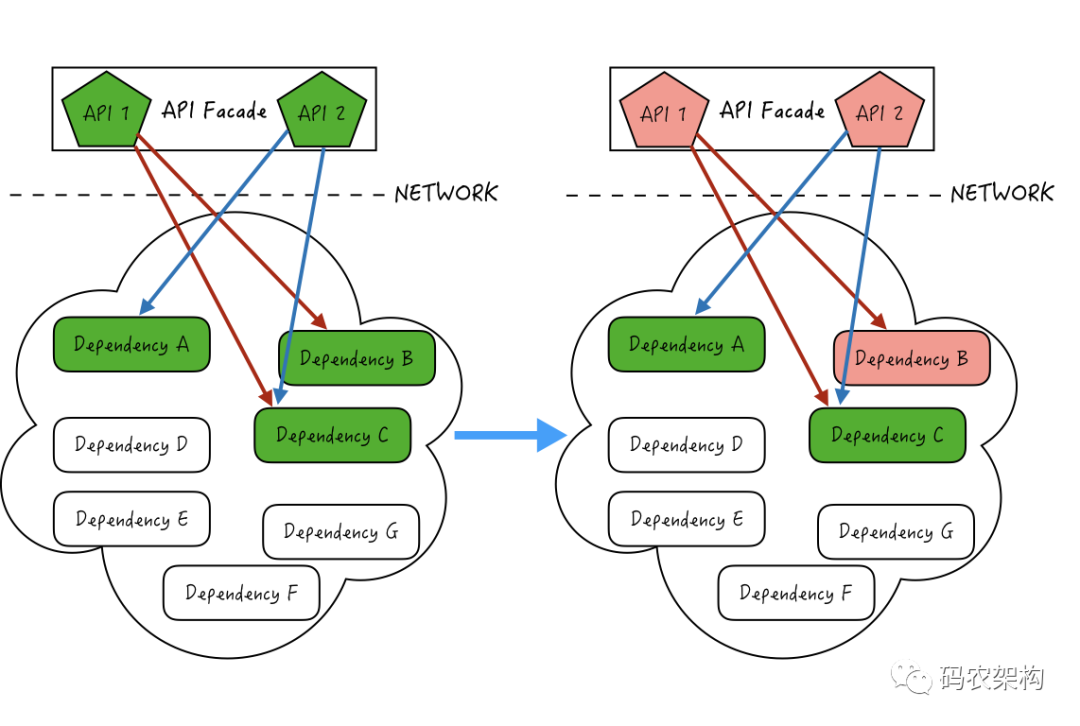 雪崩效应在多依赖服务中往往会导致一个服务出问题,从而拖慢整个系统的情况。