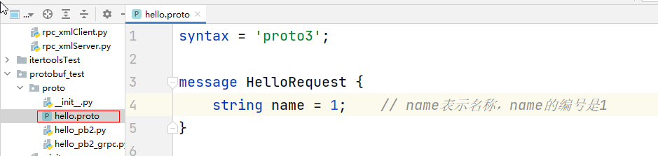 syntax = 'proto3'; message HelloRequest { string name = 1; // name表示名称,name的编号是1 }图示:pycharm中安装proto插件,就能识别proto文件,如下图